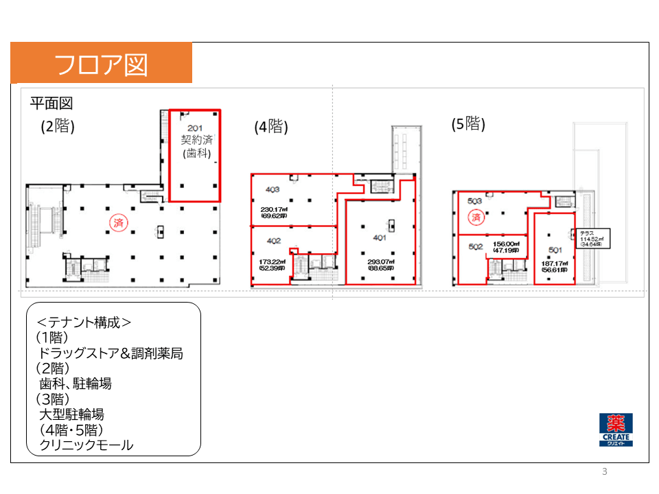 | 501 | 56.61坪(テラス34.64坪) | 坪単価14,336円(税抜) 月額賃料811,545円(税抜) | |