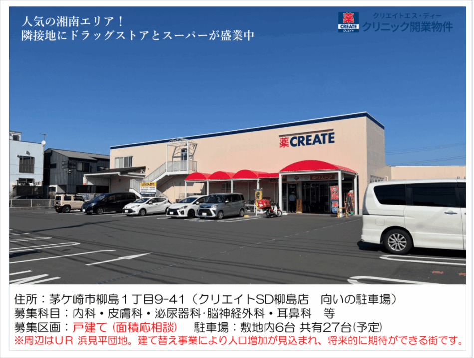 ・人気の湘南エリアで、周辺は住宅地が広がり、ファミリー層も多く住み地域です。最寄り駅は「茅ヶ崎駅」の戸建ての医院開業物件です。