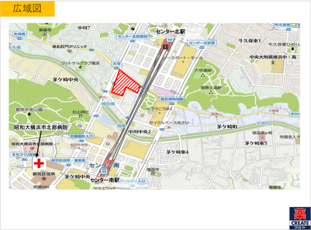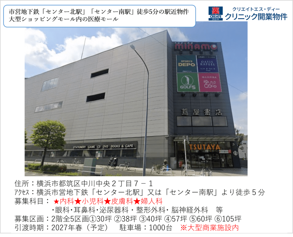 ・駐車場1,000台完備、人口が増加している都筑区の物件のため、お子様~高齢者まで幅広い層の集患が期待できます。