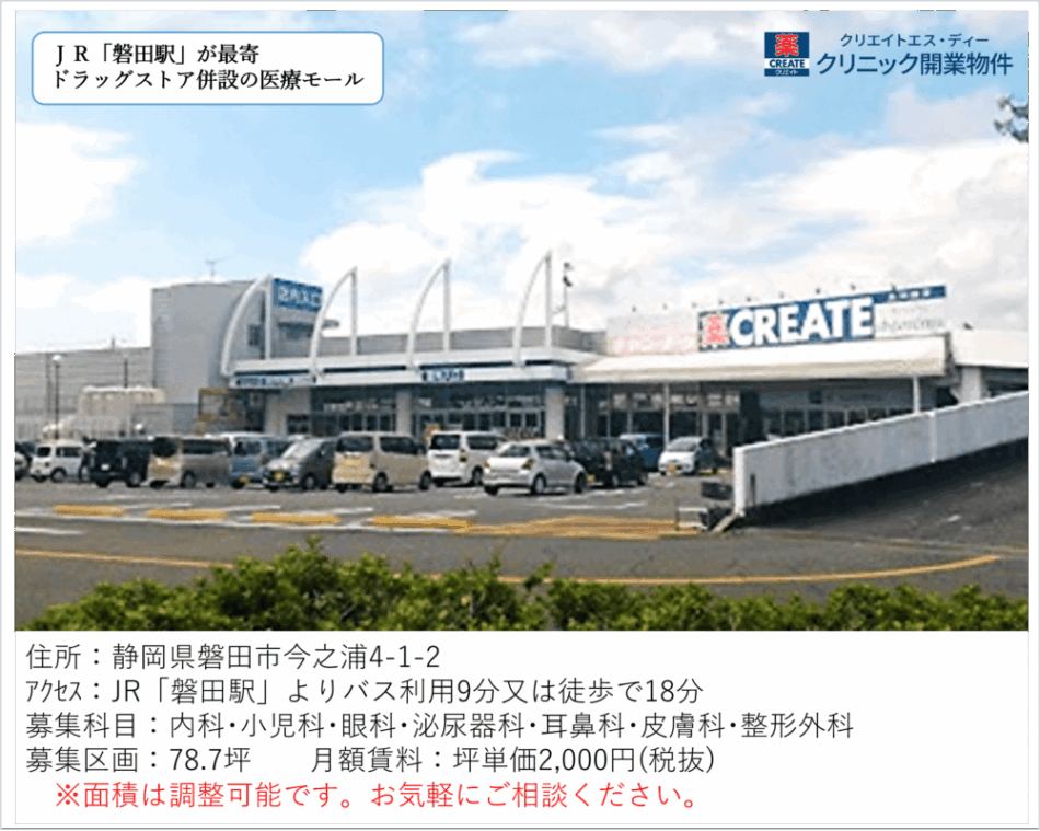 ・集客力の高いドラッグストアと100円ショップが併設しているため、クリニックの早期認知度向上が期待できます。また、受診ついでにお買い物もできる便利な施設です。
